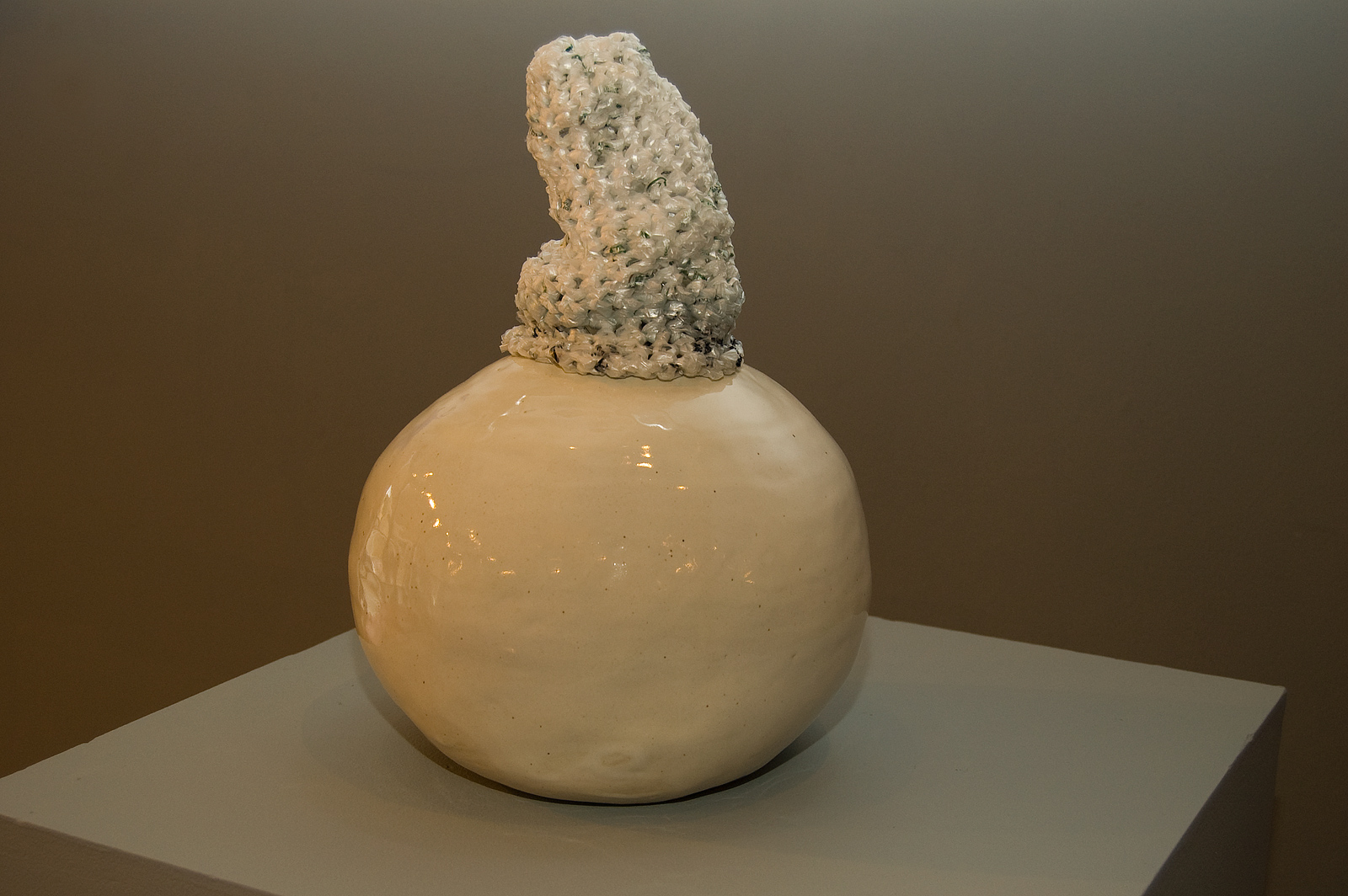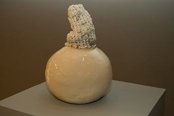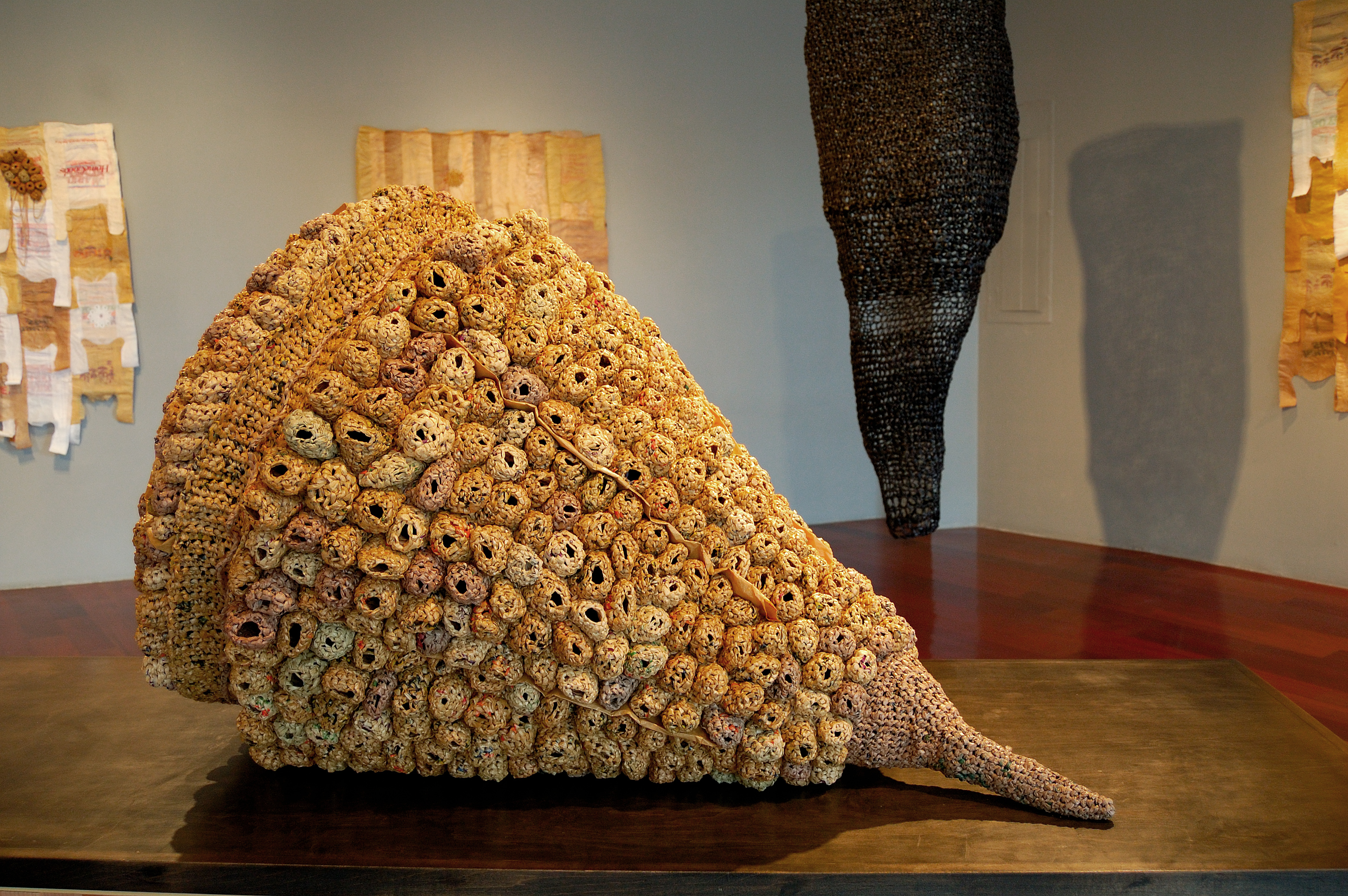 A central piece of the exhibit is an enlargement of dinoflagellata, an essential food source for larger ocean animals. The Dinoflagellata is a complex, paneled form comprised of a honeycomb-like structure perfectly suited to this method of working. Inplastibrate is a whimsical take on the nudibranch. It seems to stand like a terrier ready to fetch. Smaller pieces are playful interpretations of individual phytoplankton and zooplankton.