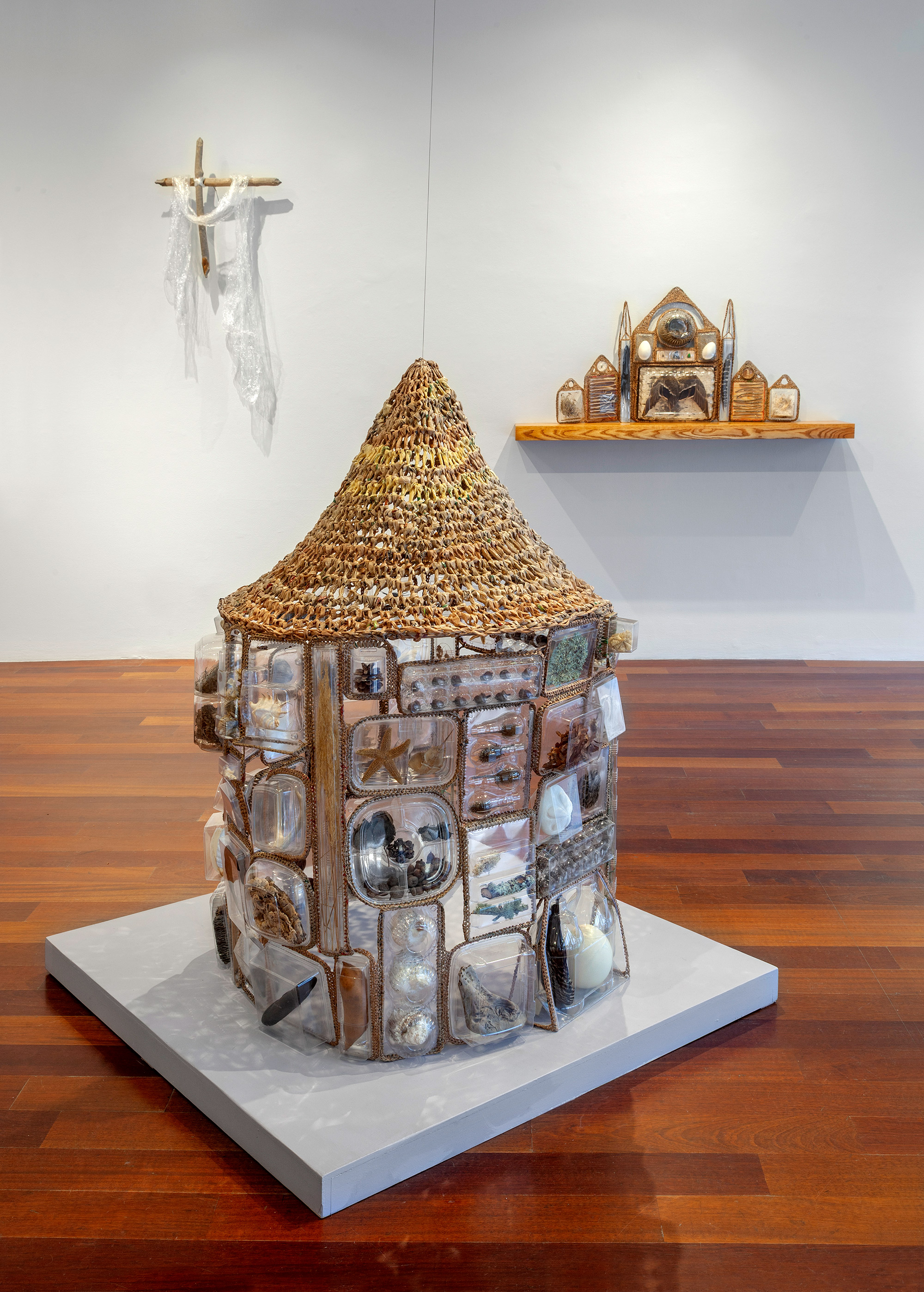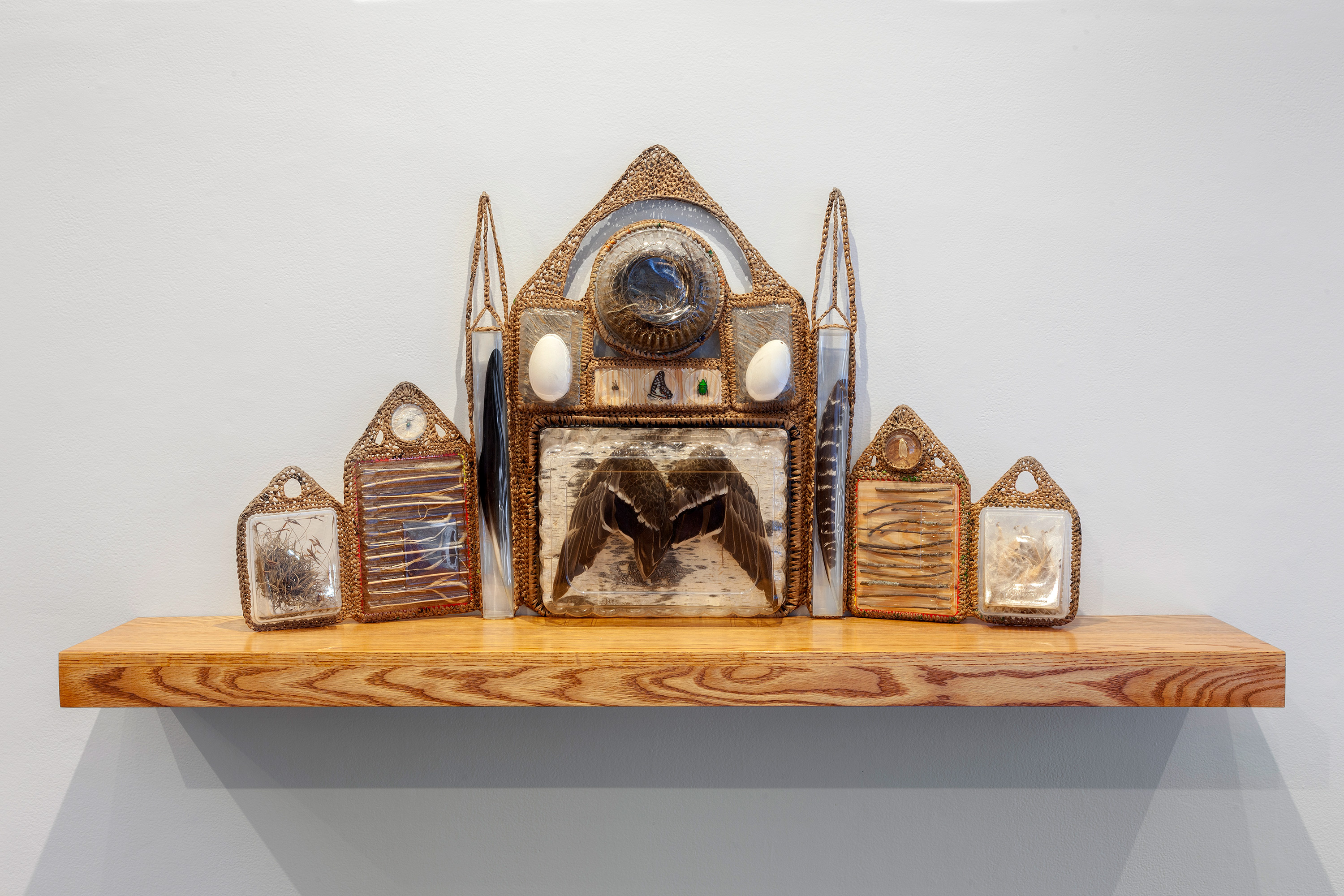 Sanctity of Nature continues my material investigation of post-consumer plastic debris, and a dialogue about the divinity of nature and the persistence of waste. Dystopian reliquaries that pair natural objects with transformed plastic in uncanny collections are displayed as altars. My work alludes to the scale of plastic pollution while questioning what our culture chooses to value and worship. The work in the exhibit: a baptismal gown, reliquaries and altars, and large-scale drawings, refer to a broader sense of divinity rather than any specific religion. In these devotional totems, carefully curated artifacts intermingle to evoke a sense of nostalgia for forgotten values. The work is at once mournful and optimistic, serving as a call to consider our stewardship of a generous planet.
